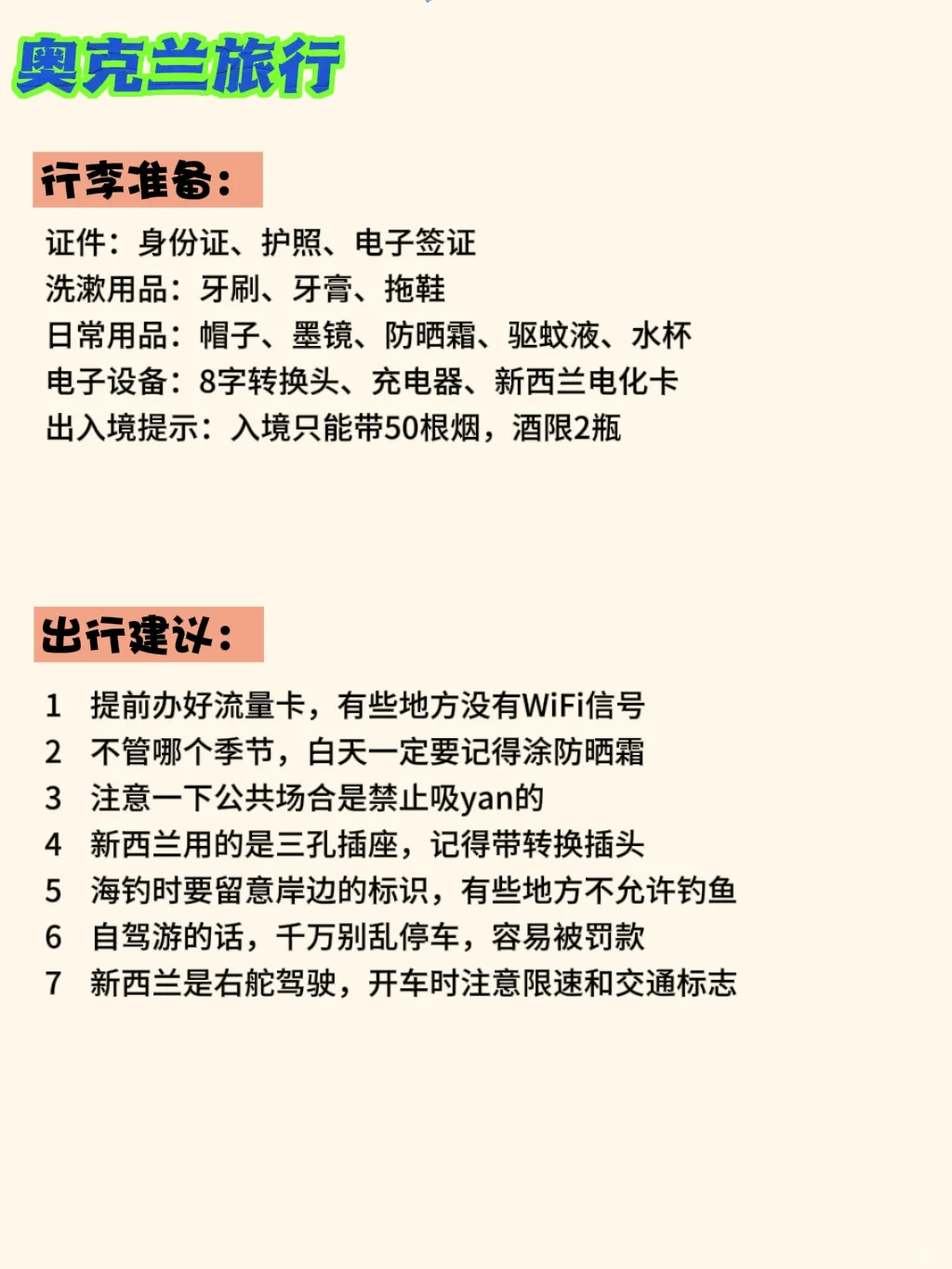 - 新西兰为右舵驾驶,行车时注意限速及交通标志