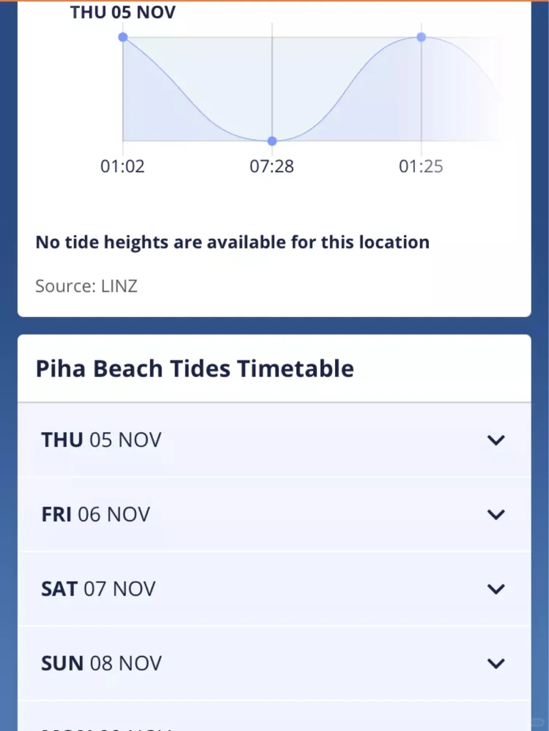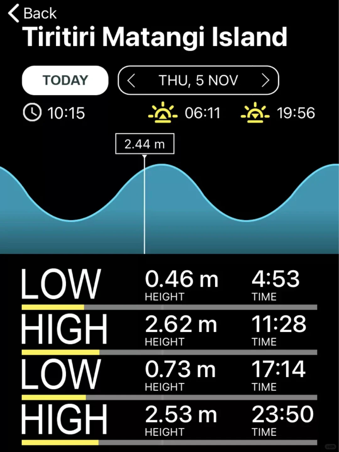 2. 手机App推荐:NZ Tides,提供各地区的潮汐信息,非常重要,因为挖青口和海螺需要在最低潮时进行,鲍鱼的捕捞同样需要选择最低潮(通常低于0.5米)。需要注意的是,免费版仅能查询未来2天的潮汐。