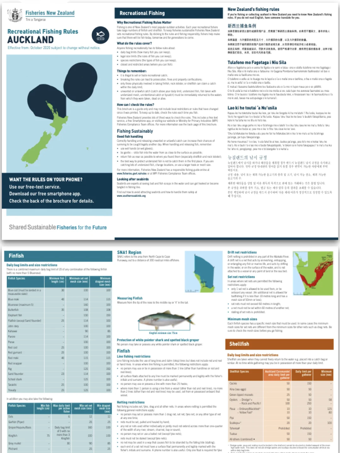 1. 手机App推荐:NZ Fishing Rules,查找各种鱼类和贝类的捕捞规定,包括数量和尺寸限制。