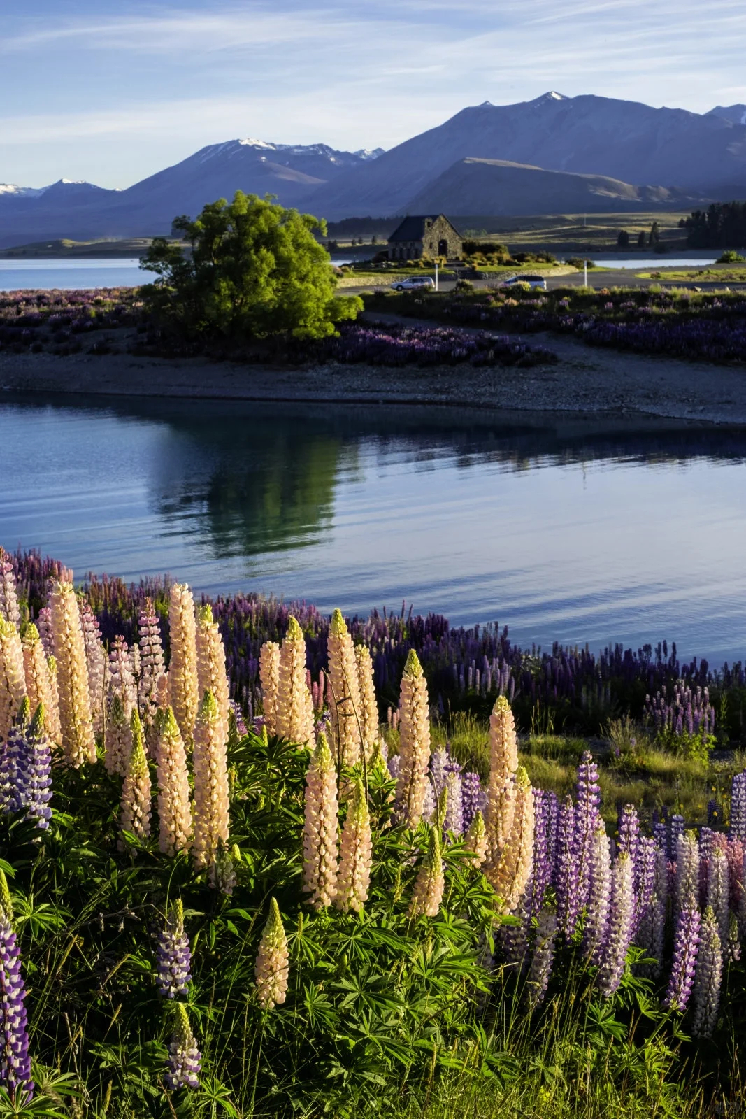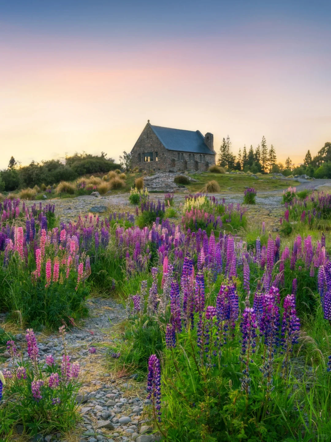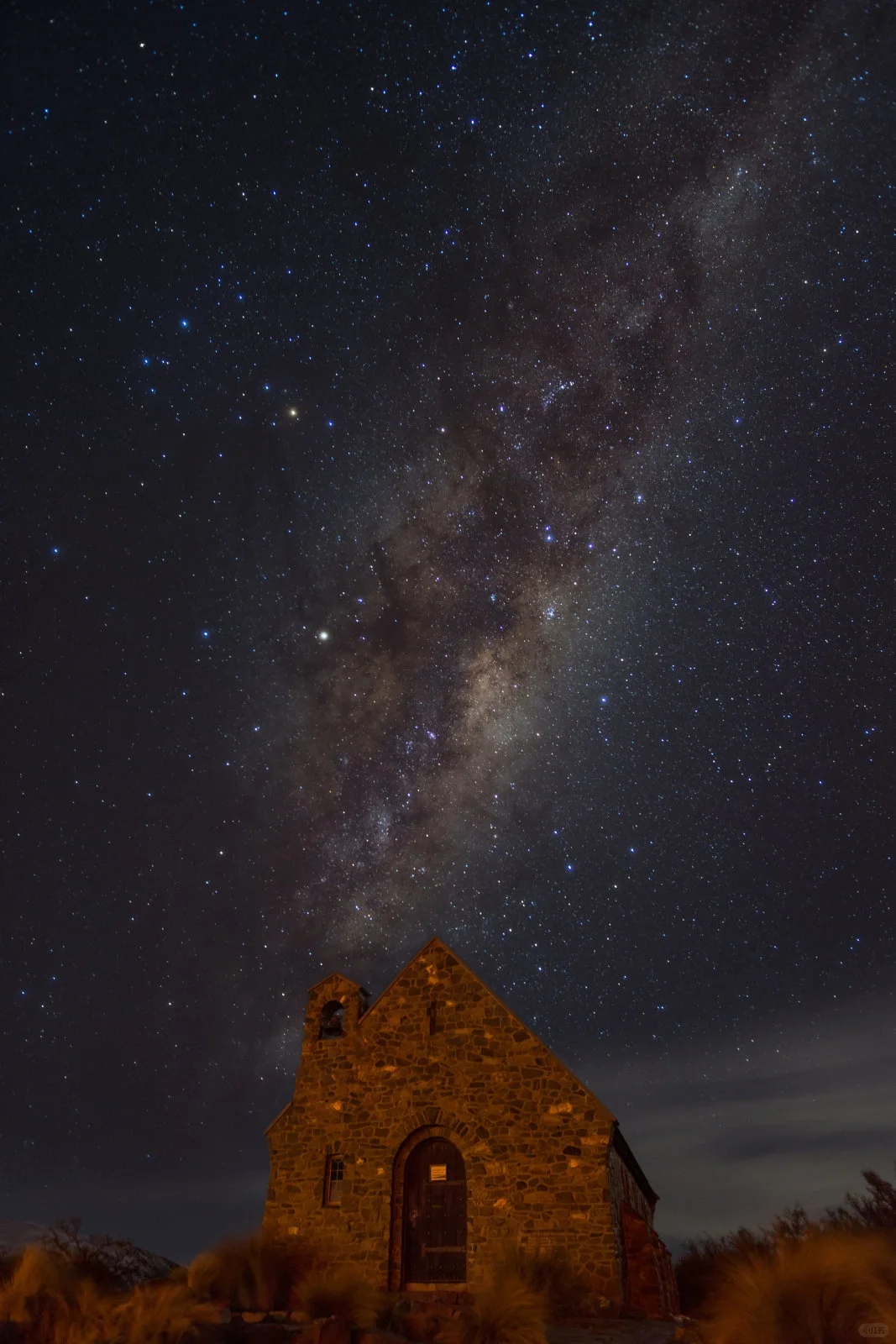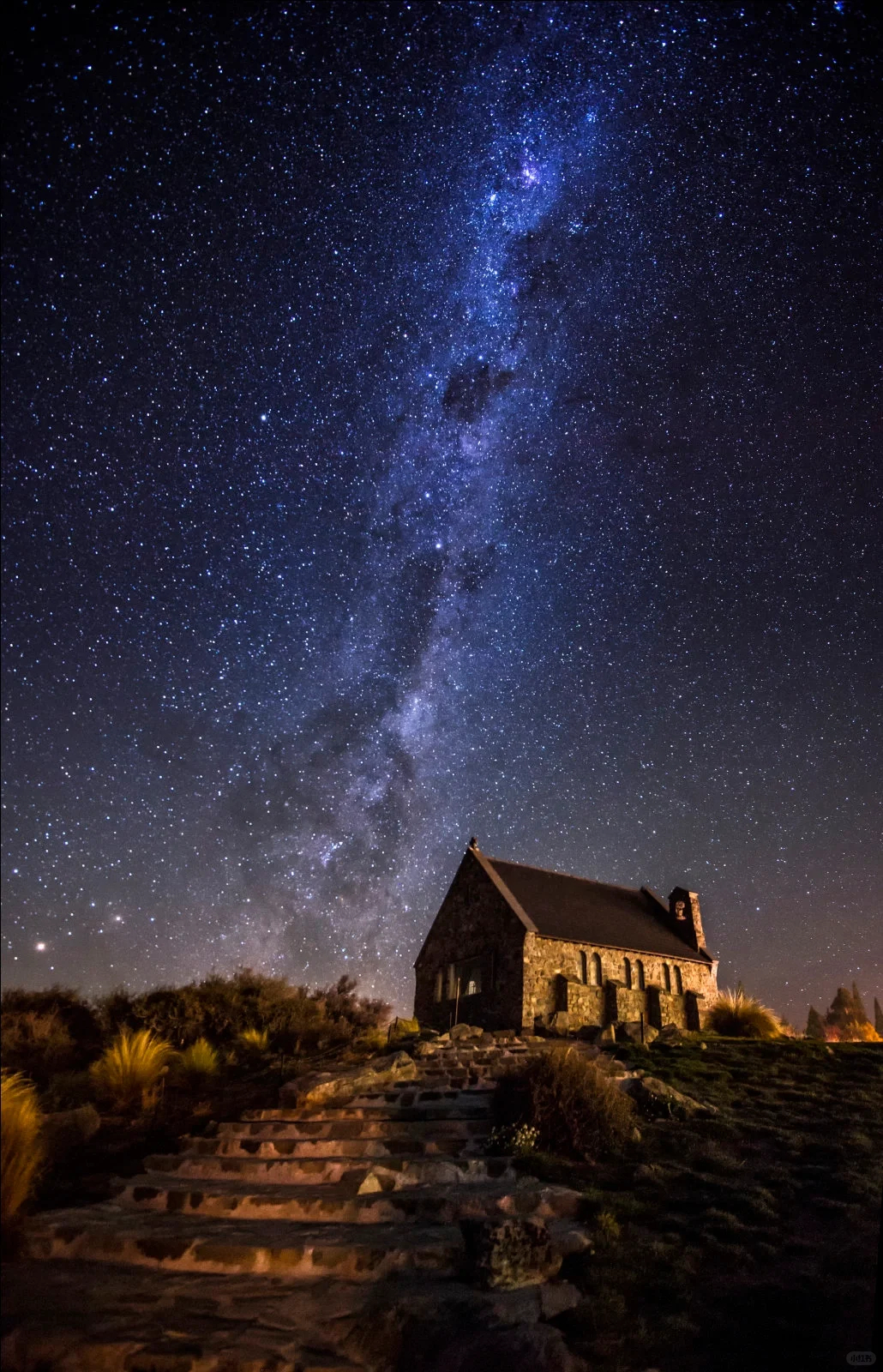 这座古朴的教堂一年四季、在不同时间段展现出迷人的面貌,吸引了众多游客前来拍摄留念。教堂与美丽的蒂卡波湖相得益彰,形成了一幅生动的画面,不仅有鲁冰花的娇艳,还有迷人的星空。